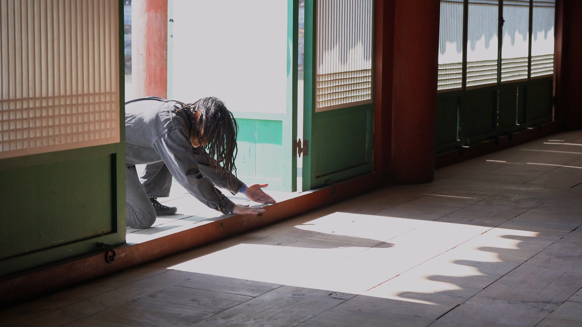 강릉 임영관 삼문과 칠사당은 시간과 기억이 축적된 신성한 존재로 나타나며 이를 두드리는 행위는 이들을 깨우고 소통하려는 일종의 의례다. 작가는 건축물에 내재한 신성과 시간성에 반응하며 인간과 비인간 사이 새로운 관계를 호출한다. 이러한 방식은 동해안 별신굿의 전통과도 맞닿는다. 강릉은 무속적 전통이 깊게 뿌리내린 지역으로, 건축과 자연에 신성을 부여하고 조화를 기원하는 제의 문화가 오랫동안 전승돼 왔다. 작가는 별신굿의 형식을 직접 차용하지는 않으면서도 굿의 리듬과 몸짓을 연상시키는 행위를 통해 장소에 감응을 불어넣는다. 작가는 강릉대도호부 관아 안 중대청을 악기이자 몸으로 바라보고 이 공간을 두드려 다시 울리고 또 한 번 깨우는 방식으로 퍼포먼스를 구성했다. 강릉 동해안 별신굿에서 무녀가 굿을 시작하기 전 타악기를 연주해 공간을 깨우는 전통에서 착안한 것이다. 진동의 파동은 멀리 있는 존재에게 이곳에서 무언가 시작된다는 신호를 보내는 행위이기도 하다. 징, 장구, 꽹과리 등 연주하는 악기에 따라 ‘깨우는 존재’가 달라지기 때문에 두드리는 행위는 단순한 소리를 넘어 전통 굿에서 중요한 ‘깨움’의 의미를 뜻한다. 작가는 이러한 굿의 원리를 바탕으로 칠사당과 강릉 임영관 삼문 같은 고건축을 ‘신성한 몸’으로 바라보고 인간화된 신체로 전환한다. 문풍지, 기둥, 벽, 바닥 같은 구조의 세부는 인체의 장기처럼 두드리는 자의 리듬에 반응하고 바람, 나무, 바다, 산 역시 이 제의에 호응한다. 이때 건축은 배경이 아닌 주체로서 퍼포먼스에 참여하고 공간은 ‘두드림’이 만들어내는 리듬을 따라 거대한 유기체처럼 깨어난다. 퍼포먼스는 인간과 비인간이 공명하는 장으로 확장된다.
