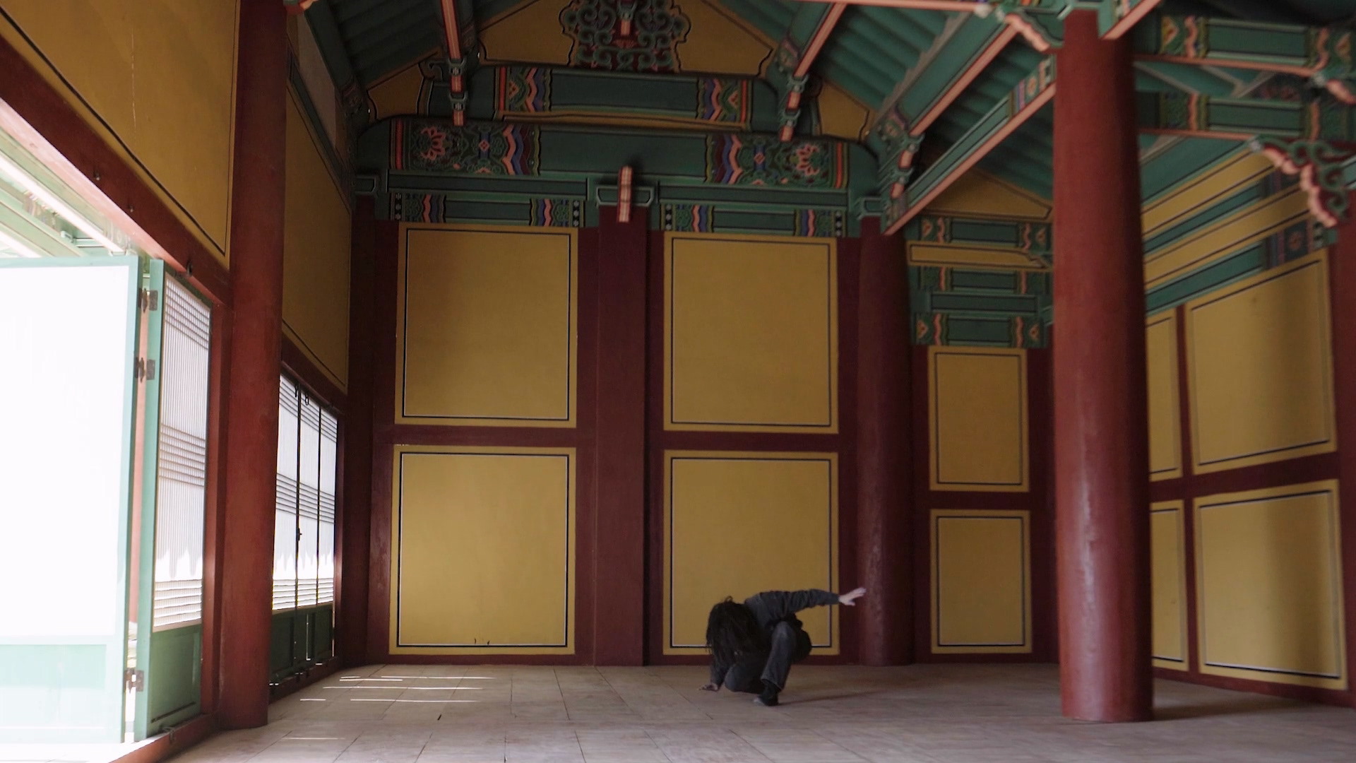 〈지금 당신이 만지는 것- 강릉〉은 강릉 임영관 삼문, 칠사당, 중대청 등 유서 깊은 건축물에서 진행한 타악 퍼포먼스를 영상으로 기록한 작품이다. 작가는 이 건축물들을 강릉을 지켜온 비인간적 신체로 간주하고 그 표면을 두드리는 행위를 통해 잠재된 호흡과 기억을 깨운다. 이때 자연, 회복, 생명의 감각이중첩되며 제의적 구조가 형성된다. 이는 인간과 비인간의 경계, 신체 수행, 제의성이라는 작가의 지속적 관심이 응축된 결과다. 여기에서 퍼포먼스는 공간, 몸, 자연을 감응의 매개로 삼는 제의로 구성된다.