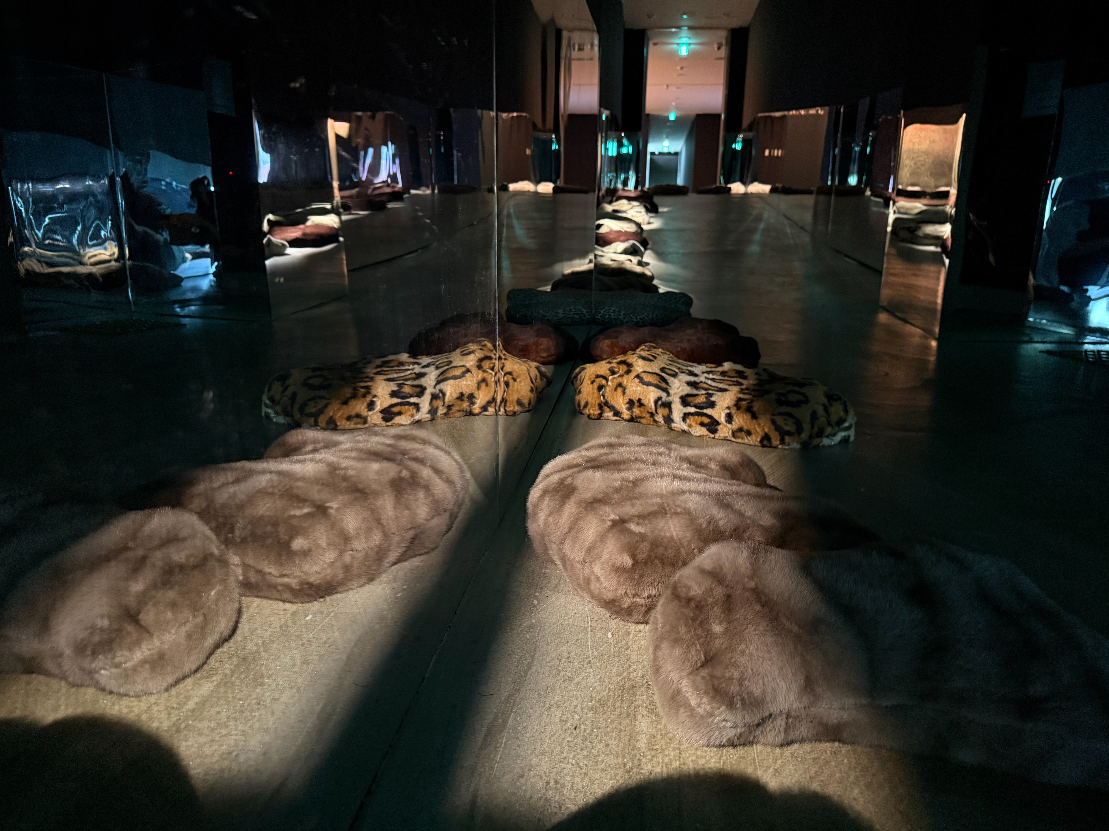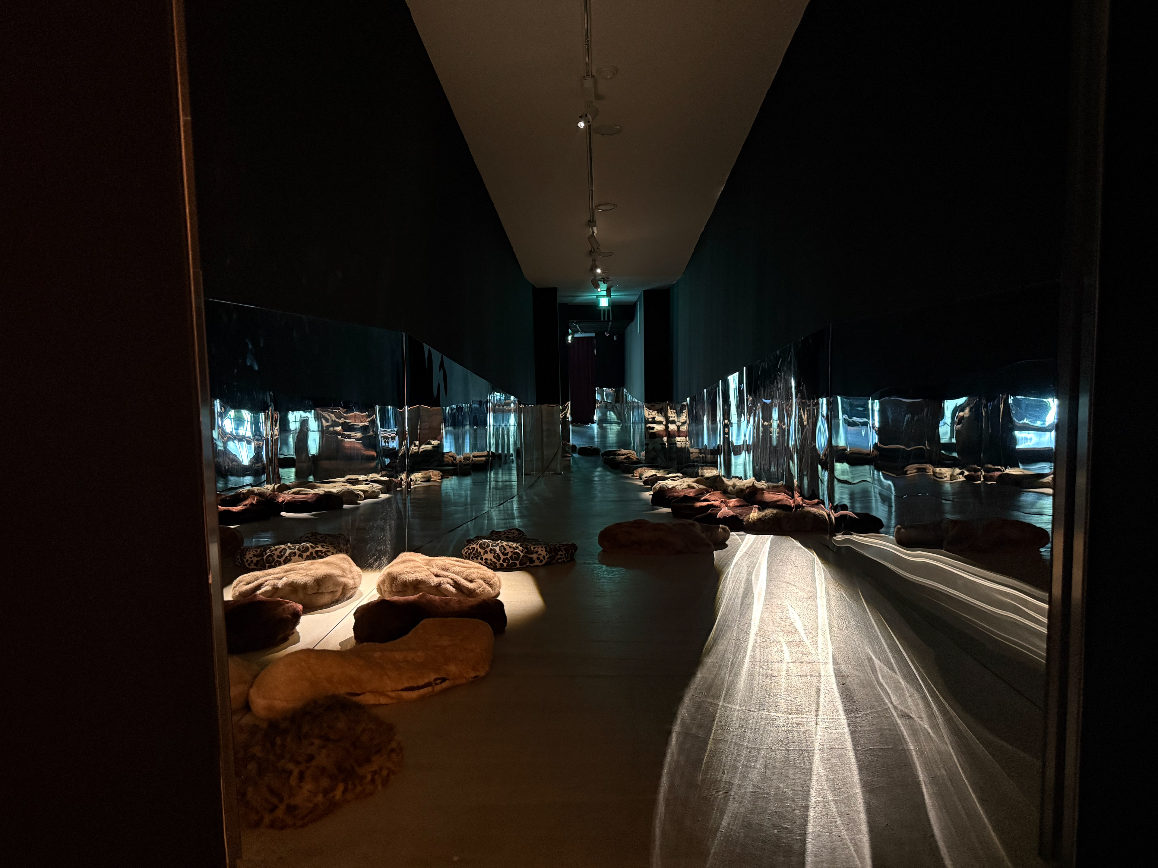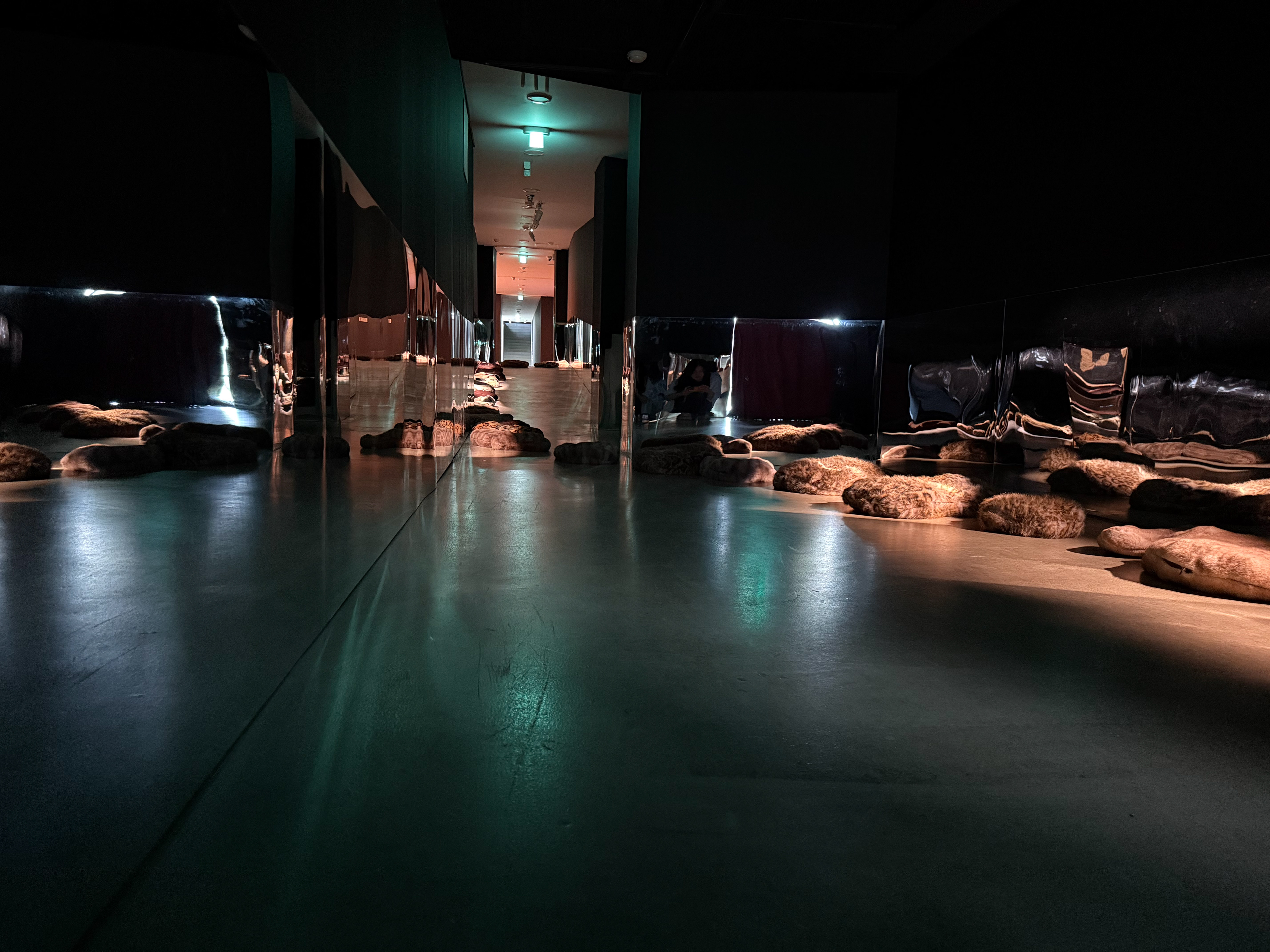 1〈용소빙장-2025년 4월 2일 3시 10분부터19분 9초까지〉, 2025, 단채널 비디오, 컬러, 사운드, 9분 9초 2025, 2 <동물 등딱지 징검다리〉, 2025, 설치, 인조가죽, 돌, 거울 등, 2025