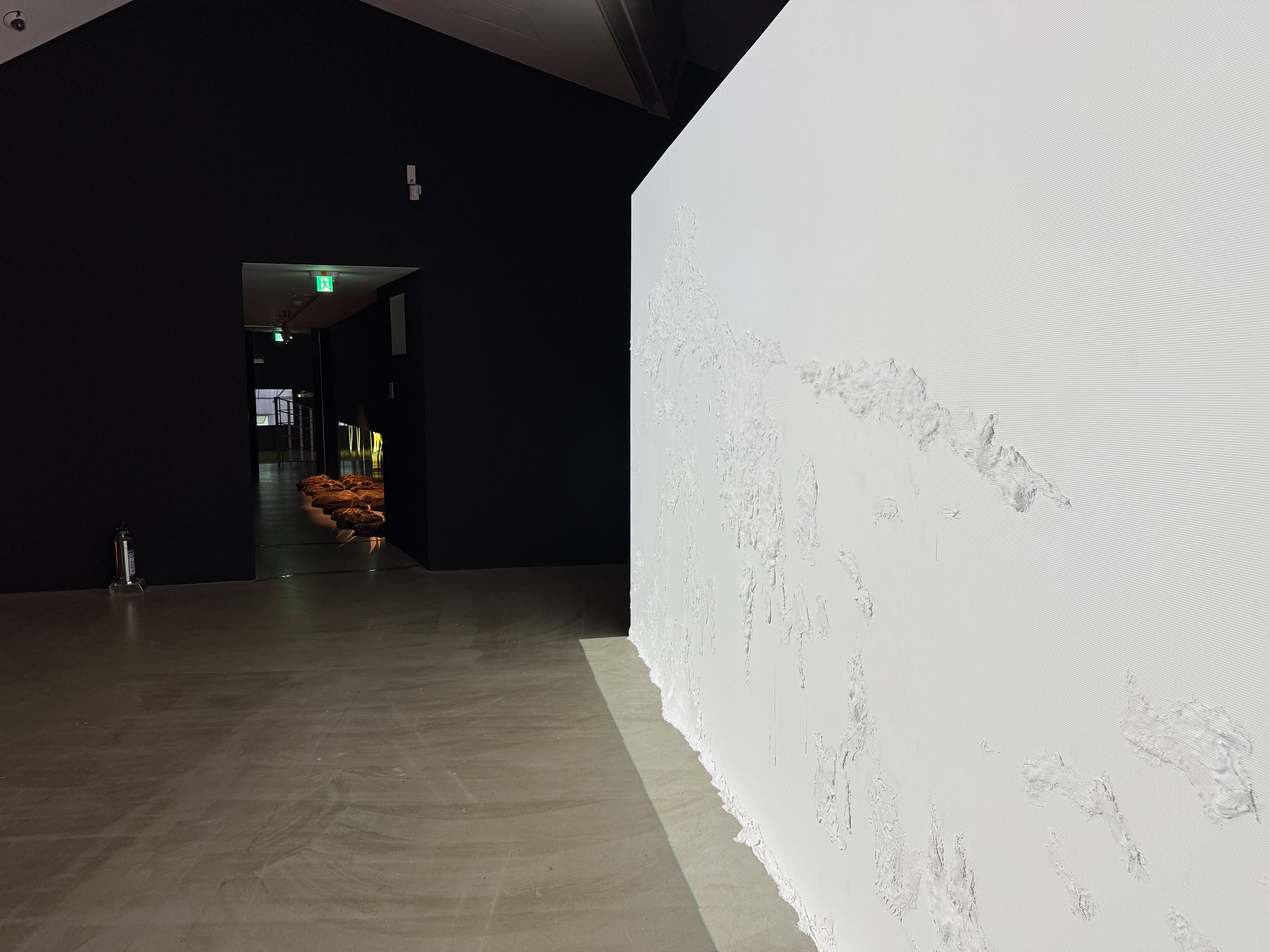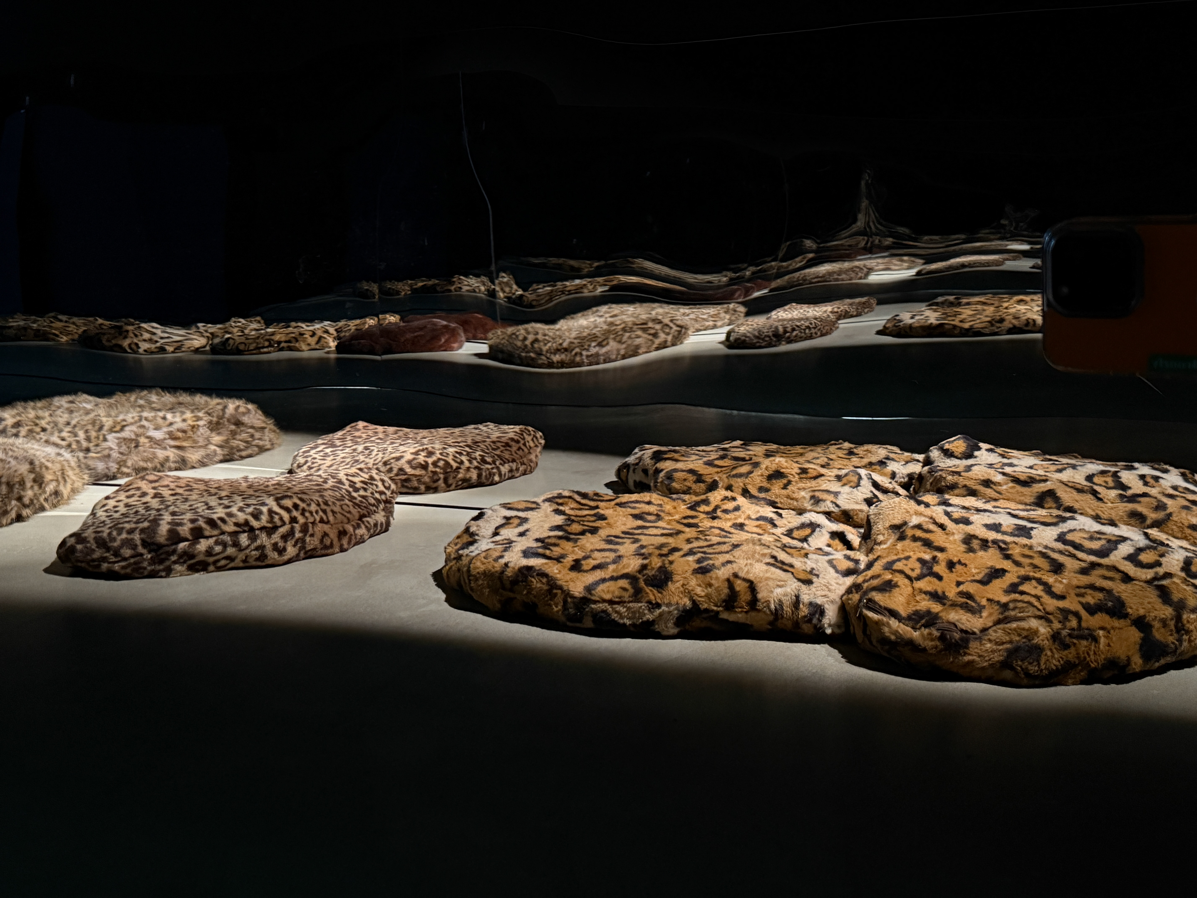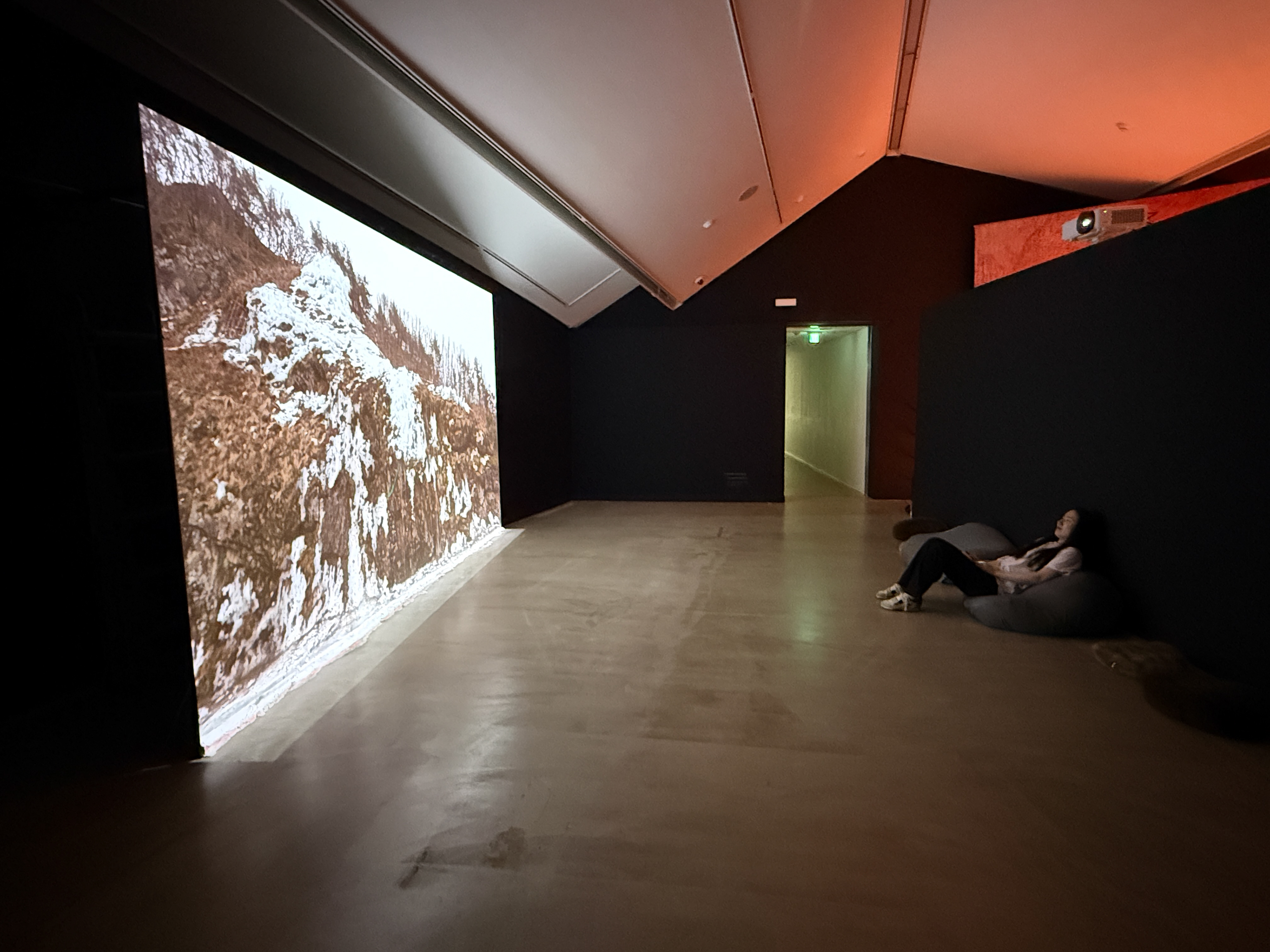 1〈용소빙장-2025년 4월 2일 3시 10분부터19분 9초까지〉, 2025, 단채널 비디오, 컬러, 사운드, 9분 9초 2025, 2 <동물 등딱지 징검다리〉, 2025, 설치, 인조가죽, 돌, 거울 등, 2025